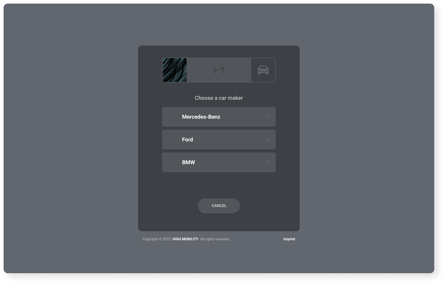 In this step we ask the user to select their vehicle brand. Every manufacturer that has been activated for your production application is listed in this screen and the user can select which car they want to connect.
