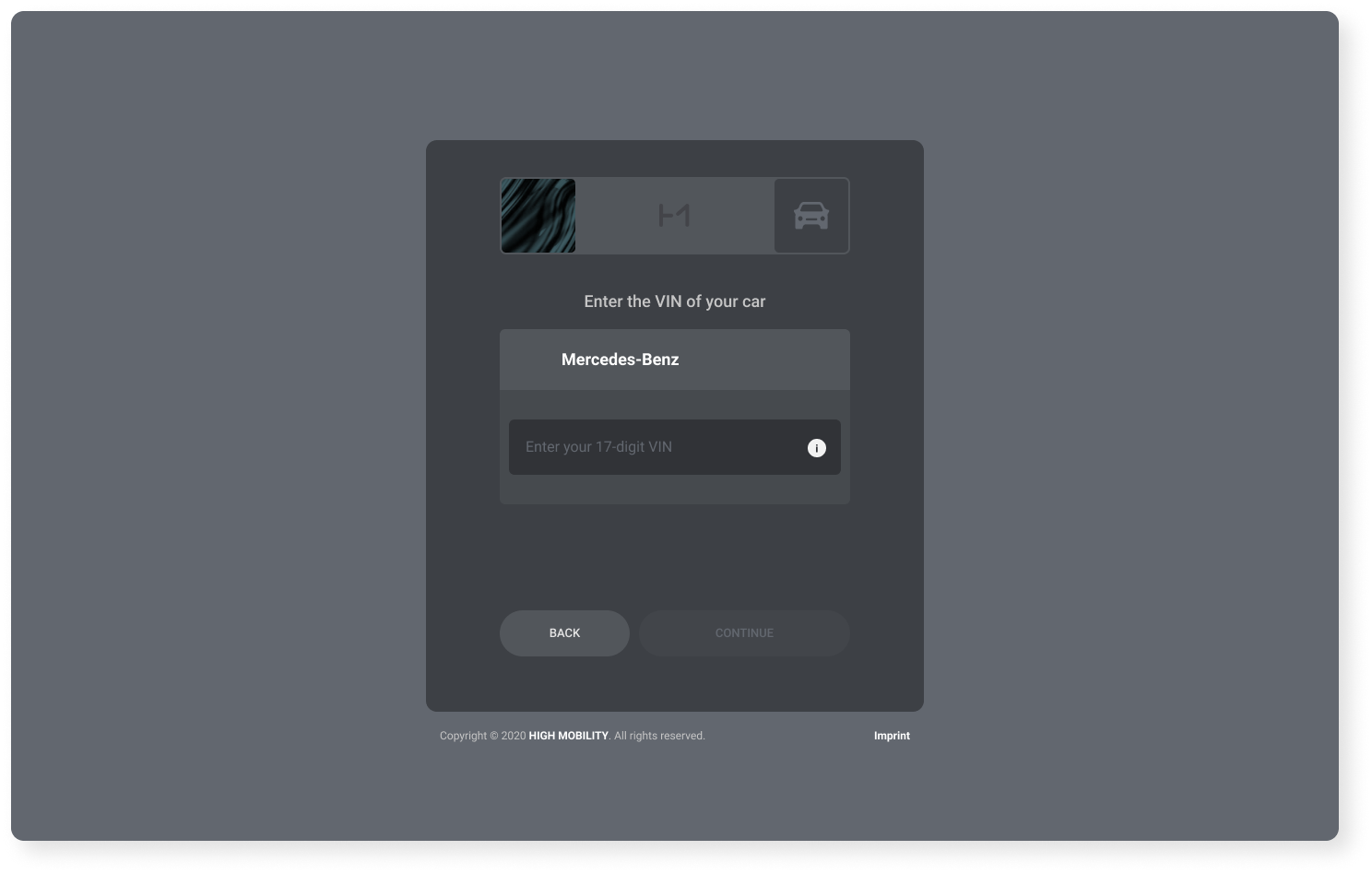 Once Mercedes-Benz has been selected as the brand, we ask the user to enter the Vehicle Identification Number (VIN) of their vehicle. In case the vehicle has been added earlier by the user, the VIN has been stored and can be selected directly from a list. The VIN entry is used later in the consent flow when the user is forwarded to the Mercedes-Benz owner panel.